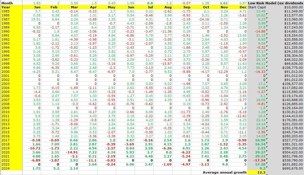 Low Risk Model returns (ex dividends and ex interest on cash holdings), using $10k as seed investment