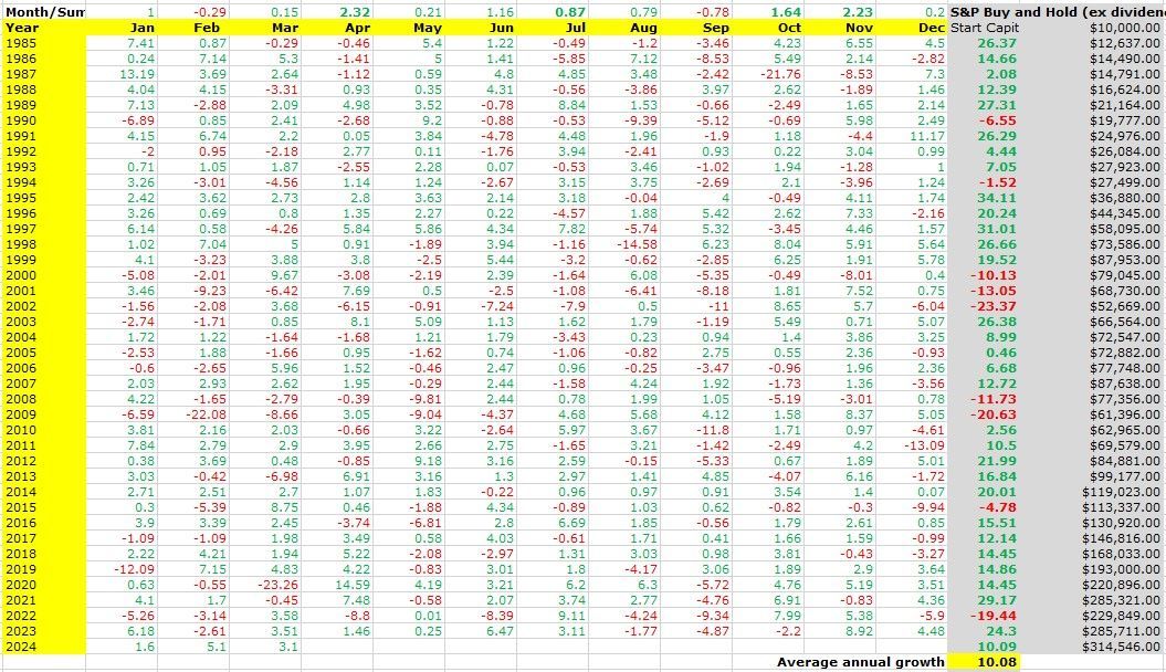 S&P 500 Buy and Hold Model returns (ex dividends), using $10k as seed investment