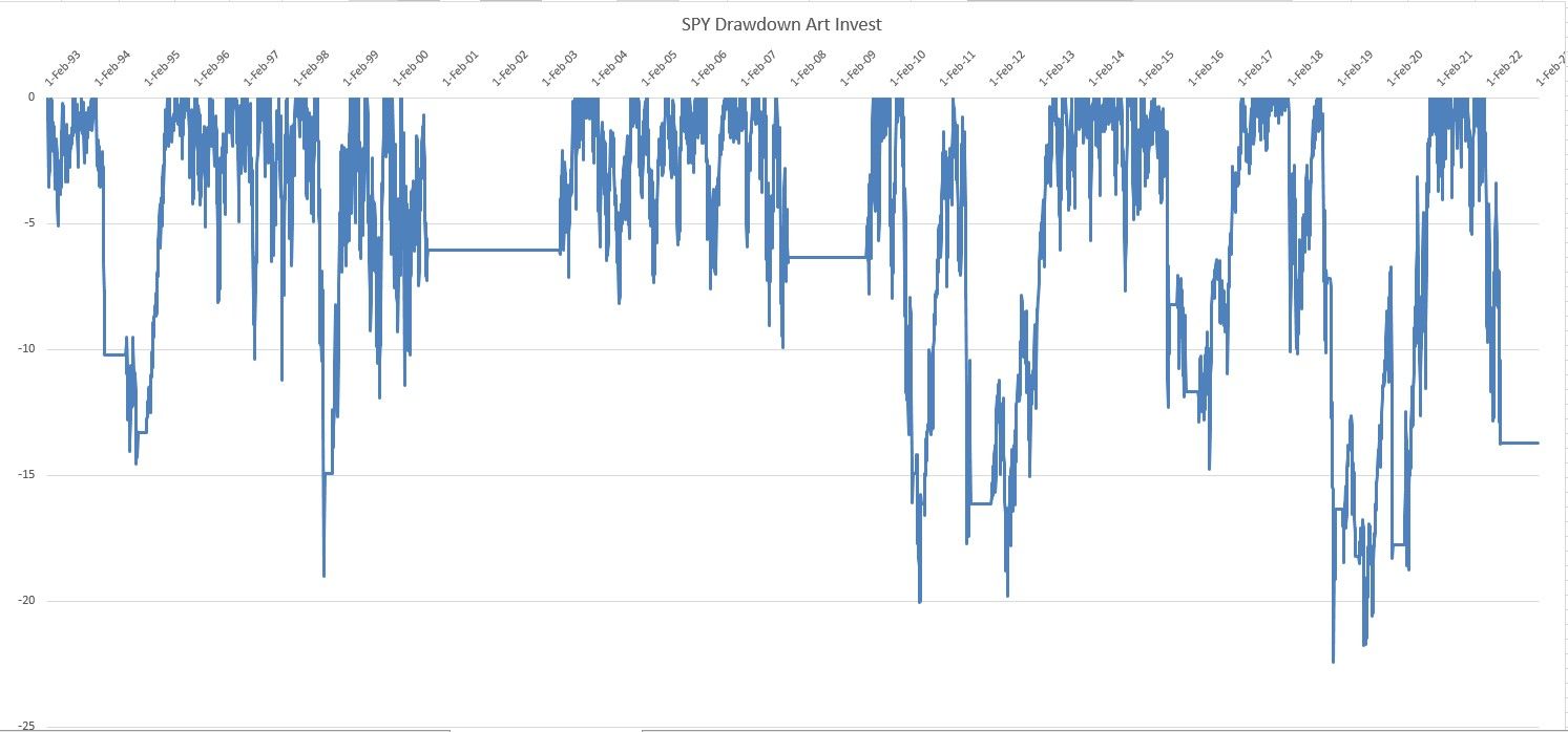 If you zoom out on the SPY chart bellow and scroll back and forth trough time, you'll see that the market is going up and down all the time. If you think about it the average investor is ether at all time high of it's investment portfolio or in a period of a drawdown. Our goal is to limit the drawdown and still participate in on the upside.