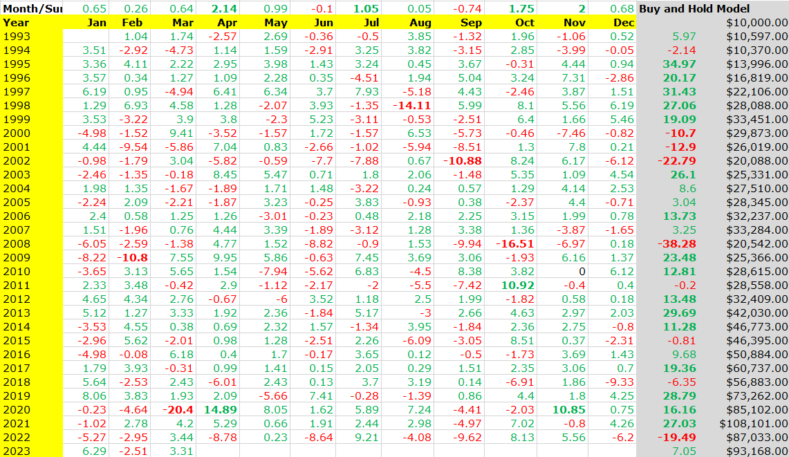 Buy and Hold model returns using the real daily SPY data from inception, using $10k as seed investment